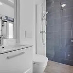 Banyo odasında duş, saç kurutma makinesi, banyo havluları sunulur.